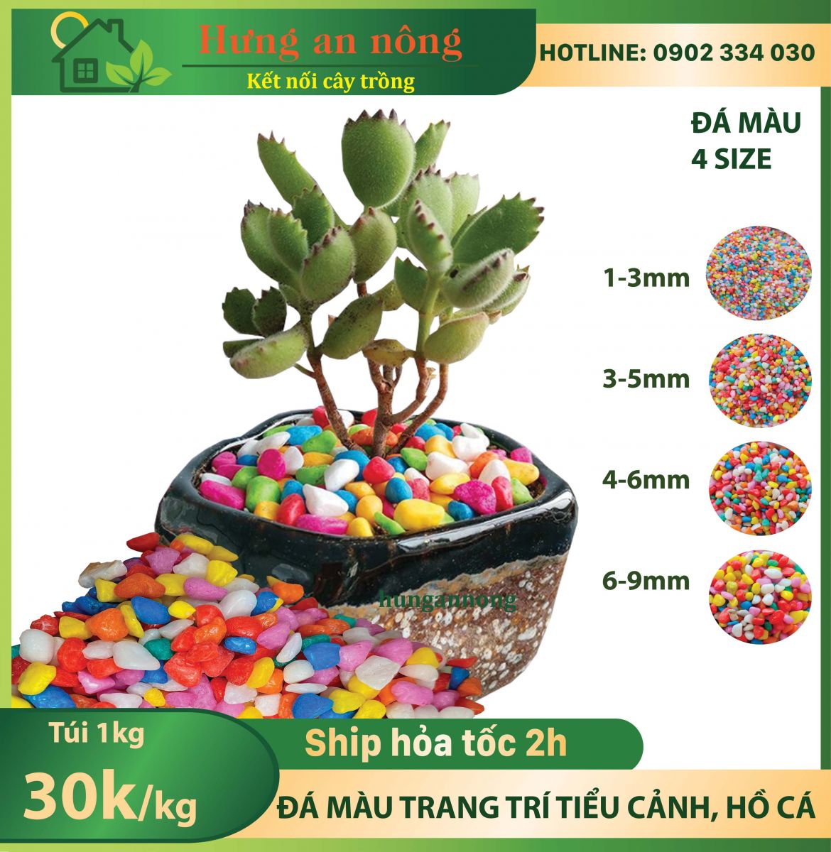 Sỏi màu trang trí tiểu cảnh, rải mặt chậu, cố định cây, lót đáy hồ cá, đồng thời làm sạch mặt chậu khi tưới không bị văng đất và cỏ mọc…